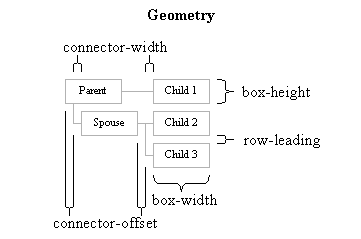 The Box Width, Box Height, Connector Offset, Connector Width, and Row Leading properties control the geometry of the chart.