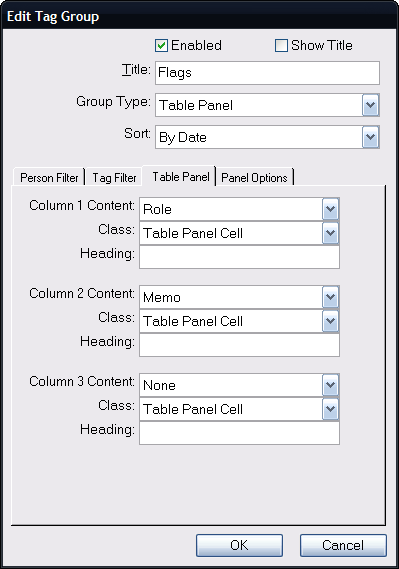 The Role property is optional and determines the name of the role assigned to the subject when the virtual event is created. Unlike a Role used with a real event in your TMG project, the Role value does not have to match an actual Role name. When the Flag Event is output via a Tag Group that is a Table Panel or List Panel, you can configure the Tag Group to display the Role in the output. So, for Flag Events, the Role field is essentially an extra free-form text field.