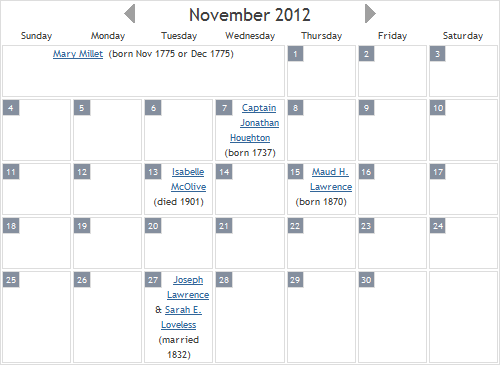 - Some partial event dates will specify a month and year but not a day. Those events appear in the calendar for the given month but are not assigned to a specific day.